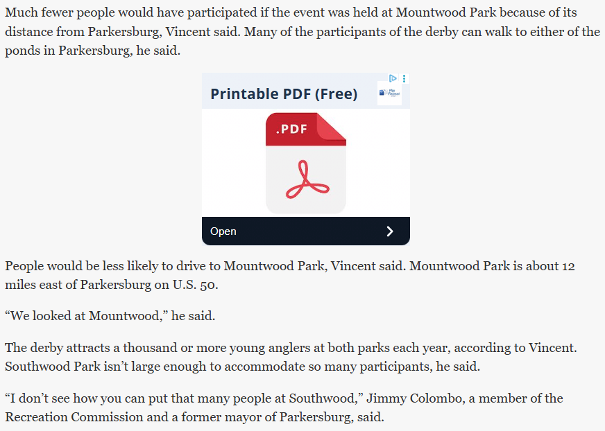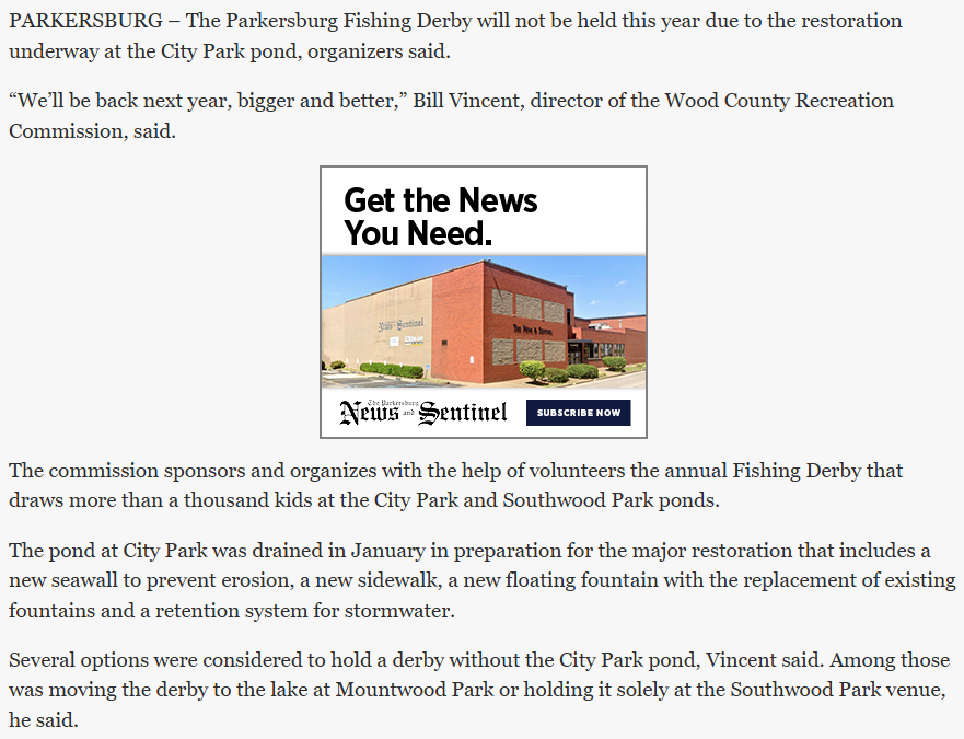 It is with heartfelt regret and careful consideration that the Parkersburg Fishing Derby Committee along with Wood County Recreation announces that this year’s Derby will not take place due to ongoing and much needed improvements. Unfortunately with logistical challenges of conducting the Derby at only one single location we will not move forward this year.